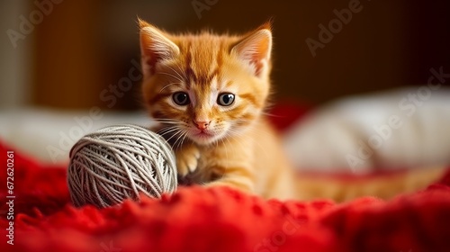 AI generated illustration of a small, playful kitten atop a vibrant red bedspread