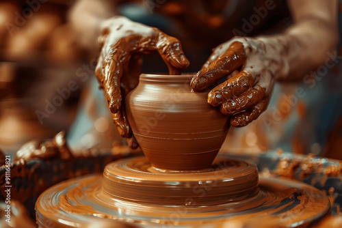 AI generated picture of hands working on a pottery wheel sculpting mug with ceramic clay