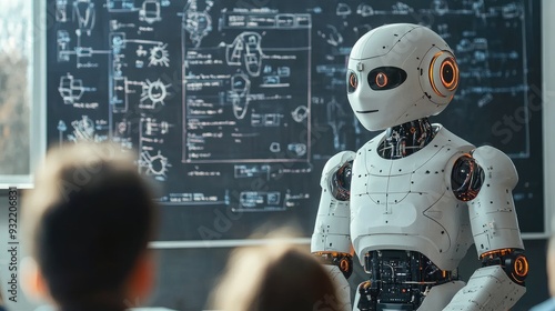 AI Robot Teaching Class in Futuristic Classroom with Chalkboard and Students