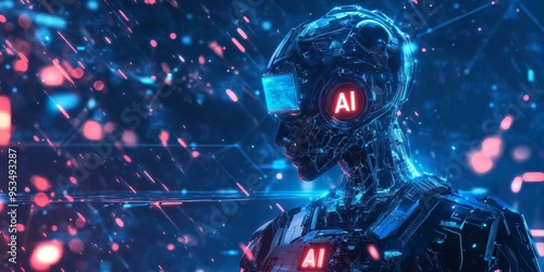 AI robot with glowing blue and red lights.