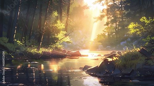 [AI生成画像]綺麗な川と森、夕方、日没1