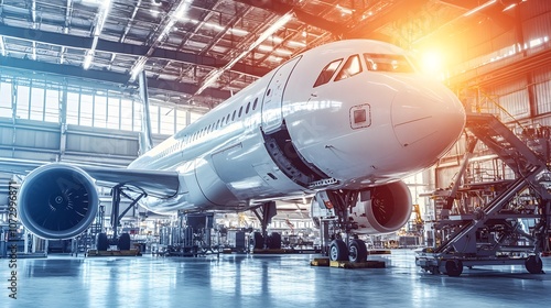 Aircraft manufacturing facility with engineers working on large airplane assembly, showcasing advanced technology and precision engineering in aviation industry.