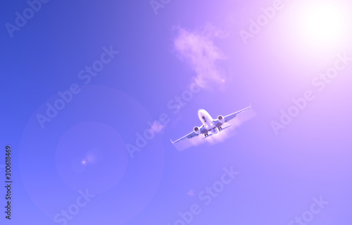 Airliner against the blue sky. The sun shines.