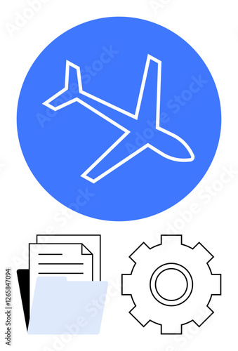 Airplane in blue circle above folder, documents, and gear. Ideal for aviation, logistics, travel planning, engineering, business processes, workflow optimization abstract line flat metaphor