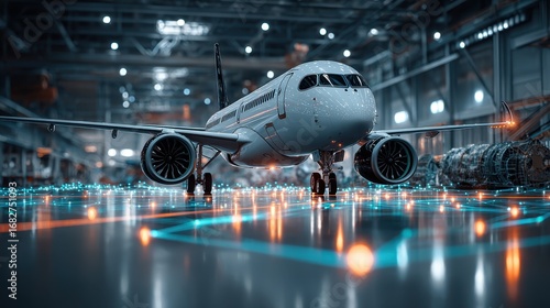 Airplane in hangar futuristic technology digital network