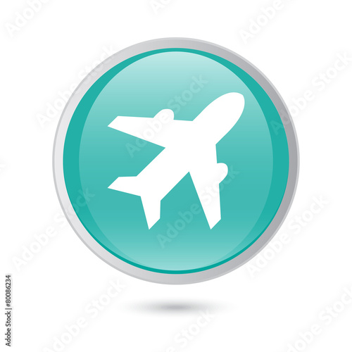 Airplane sign. Plane symbol. Travel icon. blue glossy button
