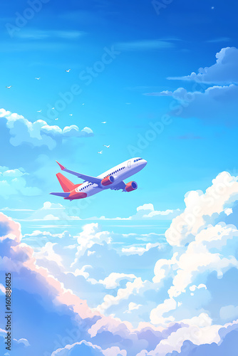 Airplane soaring through vibrant clouds in a bright blue sky, symbolizing travel and adventure