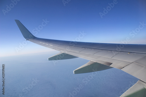 Airplane wing in the sky. View from a great height.