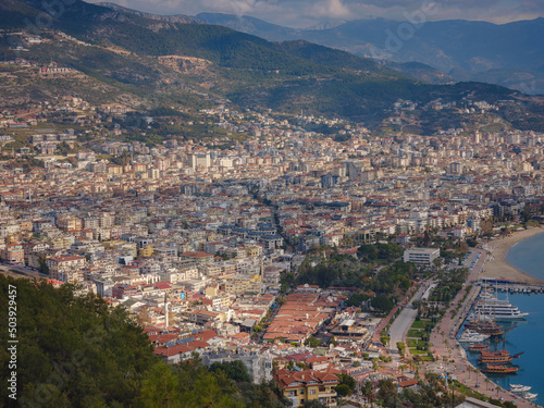 Alanya, turkey, winter walk by mediterranean sea. Ariel view of Alanya harbor from Alanya peninsula. Turkish Riviera by winter day. Beautiful cityscape. Turkish resort.