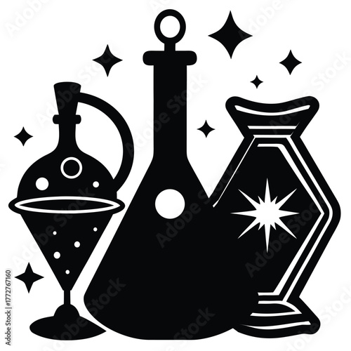 Alchemy Still Life Illustration Mystical Potion Bottles Collection Black and White