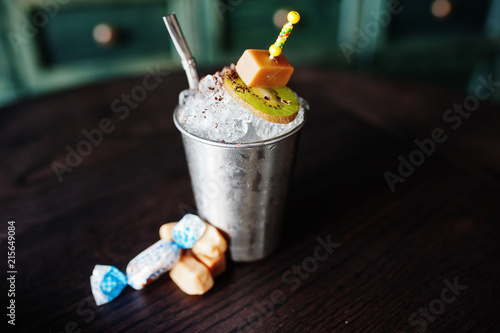 Alcoholic cocktail with sweets and candies in small silver bucket at bar table.
