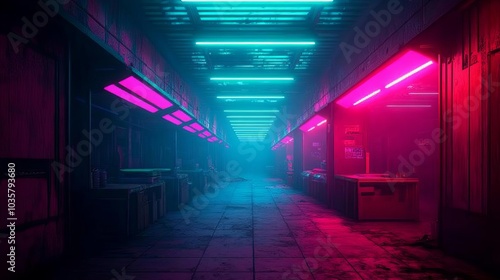 Alien marketplace, abandoned stalls, neon fog, eerie silence
