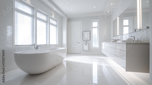 All-white luxury bathroom with a freestanding tub, sleek double vanity, and bright natural lighting.