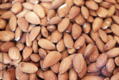 Almonds extreme close up showing dense pile of raw nuts with detailed textured surface