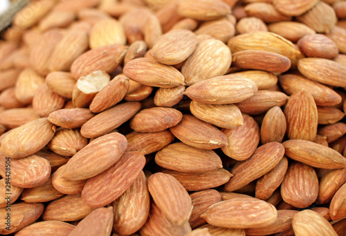 Almonds. Overhead view of raw organic almonds as a background. Peeled almond nuts. Healthy food concept. Vegetarian. Nuts pattern