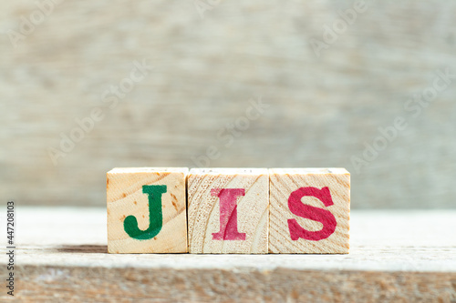 Alphabet letter block in word JIS (abbreviation of Just in sequence) on wood background