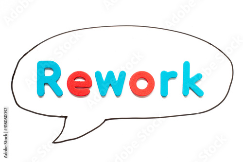 Alphabet letter with word rework in black line hand drawing as bubble speech on white board background