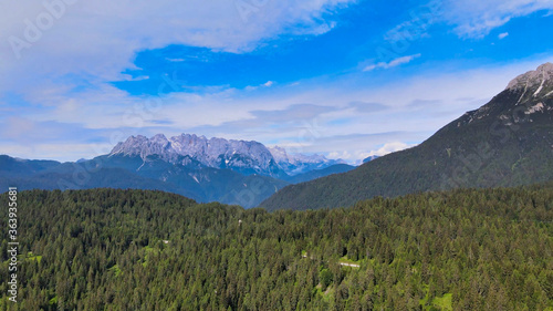 Alpin landscape with beautiful mountains in summertime, view from drone