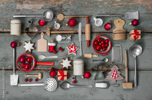 Alte Dekoration zu Weihnachten. Küchenutensilien aus Holz und Blech auf Holz Hintergrund.