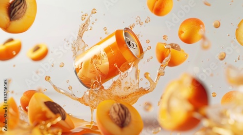Aluminum can with refreshing cold sparkling fruit juice drink. Product mockup of a soda tin can flying in the air with peaches and grapefruits. Juice drops, splashes floating around, pastel background
