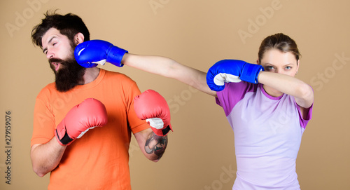 Amateur boxing club. Strength and power. Family violence. Man and woman in boxing gloves. Boxing sport concept. Couple girl and hipster practicing boxing. Sport for everyone. Equal possibilities