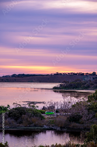 Amazing sunset over the lakes with a car driving between lakes, Tower Hill, Victoria, Australia