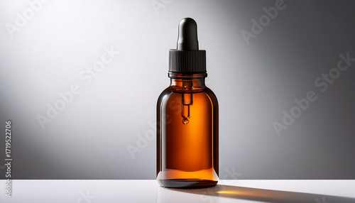 Amber Bottle With Dropper On A White Stand Isolated Against A Gradient White Background Subtle Lighting Accentuates The Bottle S Form And Its Shadow On The Platform
