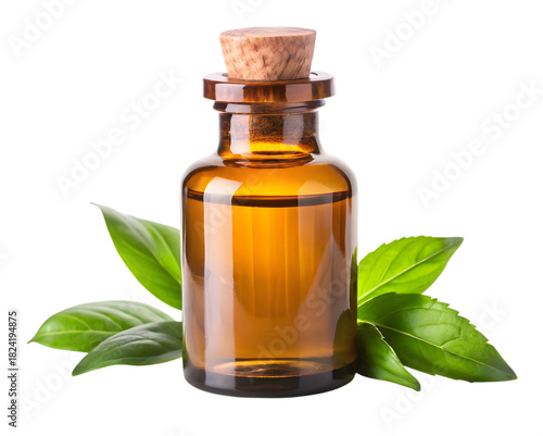 Amber glass bottle with essential oil isolated on transparent background