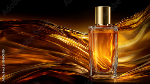 Amber perfume bottle on golden liquid wave background, showcasing elegance and luxury. Free space for text or branding. Mockup for advertisement