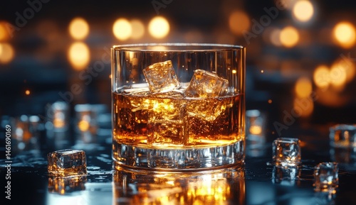 Amber whiskey glass with ice cubes