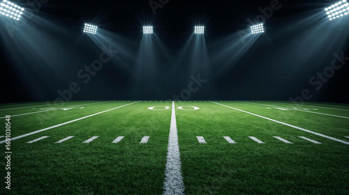 American football field at night from 50-yard line with intense floodlights and dramatic shadows.