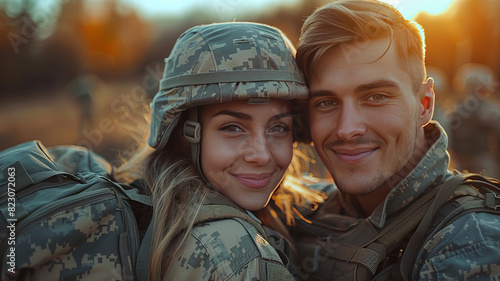 American smiling soldier hugs his wife and child against the background of the them home,generative ai