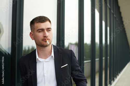 Amidst the corporate hustle, a modern businessman in a black suit takes a smoke break outside his workplace, seeking a moment of relaxation in the midst of a busy day.