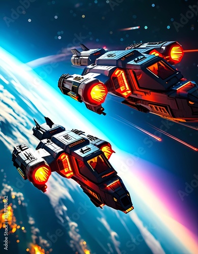 Amidst the vastness of the universe, two sleek spaceships surge through space, their engines glowing brightly as they trace radiant paths across the dark canvas of the cosmos Generative AI
