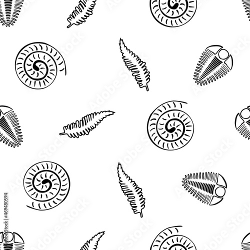 Ammonite trilobite fern vector seamless pattern background. Hand drawn spiral-form shell cephalopod and arthropod ribbed fossils, ferns. Extinct marine predators and plant life backdrop. For education
