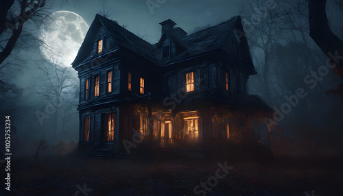 An abandoned house stands in a dark, cold Halloween night. The house has broken windows and wide open doors.