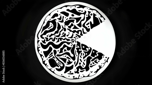 An abstract black and white illustration depicting a pizza slice with complex, swirling patterns