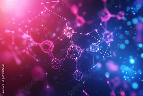 An abstract digital background image featuring molecular structures, geometric shapes, and modern data connections, symbolizing the fusion of healthcare and technology, innovation, and modern medicin