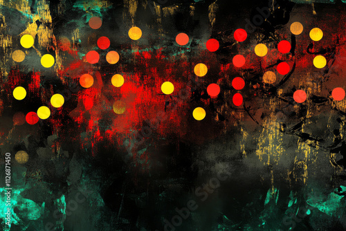 An abstract digital background of scattered luminous dots in red, green, and yellow over a dark, textured surface.