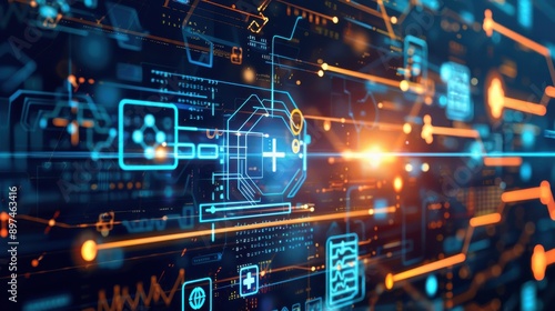 An abstract digital background with medical icons and data streams, representing the integration of technology and healthcare, and the importance of digital innovation in modern medical practices
