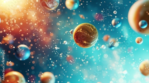 An abstract digital image depicting a cosmic environment filled with floating orbs in various sizes and colors, against a vibrant backdrop of blues and oranges. The image evokes a sense of wonder and