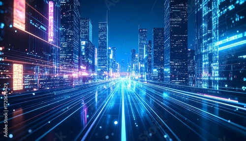 An abstract, futuristic cityscape with neon lights and glowing data lines creating a sense of speed and technology, reminiscent of a cyber-punk city.