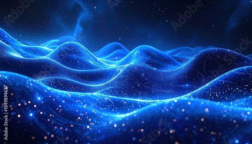 An abstract, glowing landscape of undulating, neon-blue waves, speckled with sparkling particles, under a starry sky