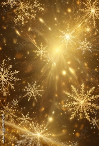 An abstract gold background features a mesmerizing light show of swirling snowflakes and twinkling lights, evoking the magic of Christmas, winter wonderland scene, festive atmosphere, shimmering snow
