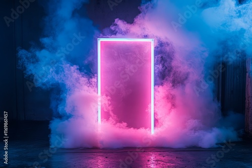 An abstract, neon-illuminated door frame surrounded by smoke in a dark room, with pink and blue lighting, and smoke plumes floating on the floor, creating a cinematic atmosphere.