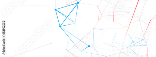 An abstract network of fine lines and nodes forms a dynamic structure in blue and red tones. Geometric shapes create a sense of digital communication, technology and virtual space.