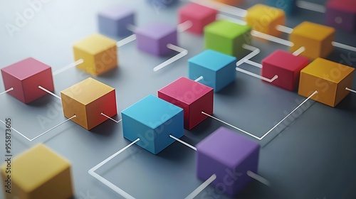 An abstract rendering of network connections with vibrant cubes, illustrating complex technological links.