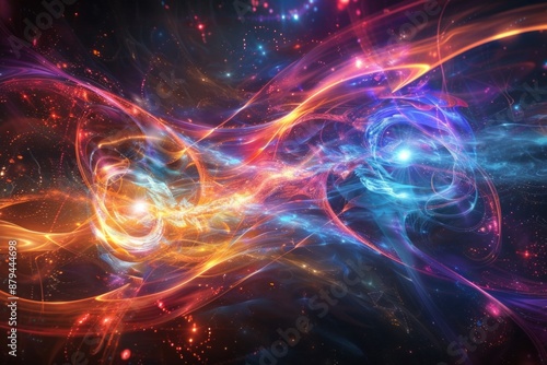 An abstract visualization of quantum entanglement, with swirling, intertwined particles and waves of light in a spectrum of bright, contrasting colors.
