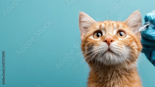 An adorable ginger cat looks up while receiving a vaccination against a turquoise background.