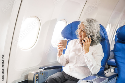 An adult woman sits by the window on a passenger plane, eagerly traveling abroad. She gazes at the clouds, anticipating new experiences and adventures in a foreign land.